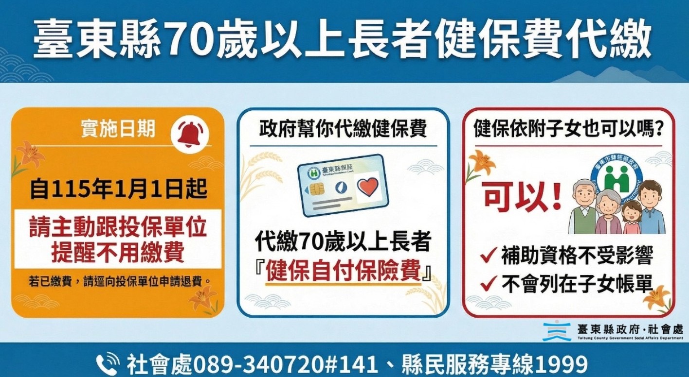 臺東縣政府自 115 /1 /1 起,提供70歲以上長者健保費代繳服務