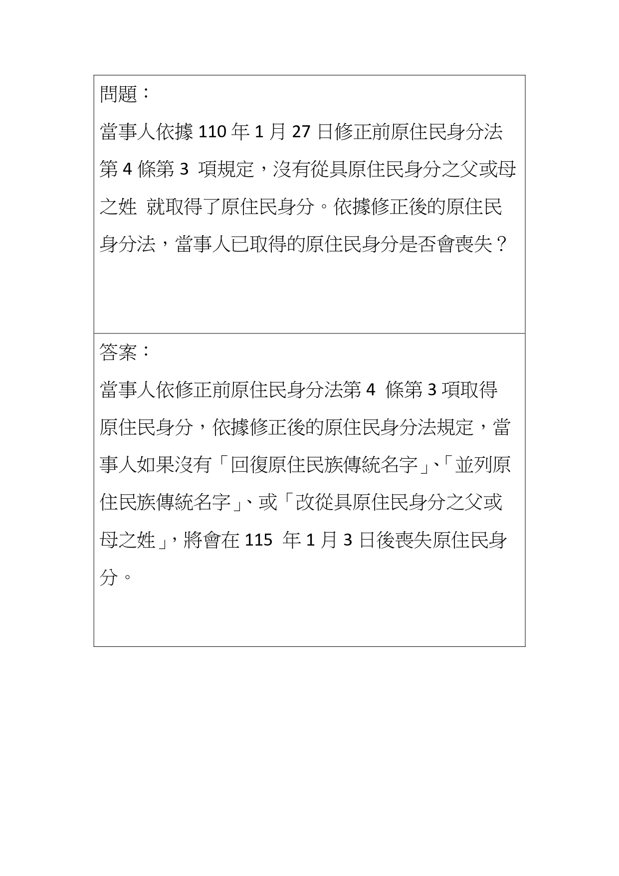 【宣導】 當事人依修正前原住民身分法第4 條第3項取得 原住民身分,依據修正後的原住民身分法規定,當事人如 果沒有「回復原住民族傳統名字」、「並列原住民族傳統名 字」、或「改從具原住民身分之父或母之姓」,將會在115 年1月3日後喪失原住民身分。